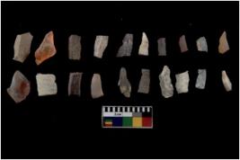 | Description / विवरण | Specimen of flakes tool with prominent flaking marks. It made up of a short flakes with sides trimmed. |