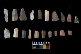 | Description / विवरण | Specimen of flakes tool with prominent flaking marks. It made up of a short flakes with sides trimmed. |