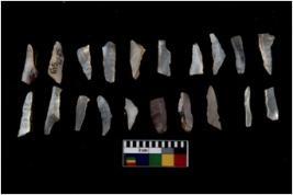 | Description / विवरण | Specimen of flakes tool with prominent flaking marks. It made up of a short flakes with sides trimmed. |