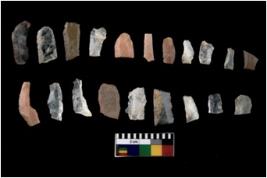 | Description / विवरण | Specimen of flakes tool with prominent flaking marks. It made up of a short flakes with sides trimmed. |