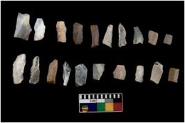 | Description / विवरण | Specimen of flakes tool with prominent flaking marks. It made up of a short flakes with sides trimmed. |