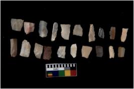 | Description / विवरण | Specimen of flakes tool with prominent flaking marks. It made up of a short flakes with sides trimmed. |