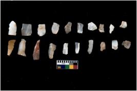 | Description / विवरण | Specimen of flakes tool with prominent flaking marks. It made up of a short flakes with sides trimmed. |