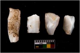 | Description / विवरण | These are n 4 of worked tools. They are tapering at one end and have sharp edges. Some have round base and some have flat base. They show dominant irregular scar pattern. |