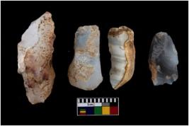| Description / विवरण | These are n 4 of worked tools. They are tapering at one end and have sharp edges. Some have round base and some have flat base. They show dominant irregular scar pattern. |