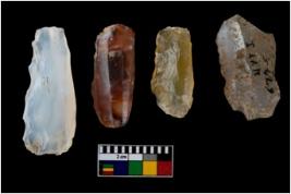 | Description / विवरण | These are n 4 of worked tools. They are tapering at one end and have sharp edges. Some have round base and some have flat base. They show dominant irregular scar pattern. |
