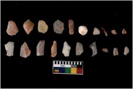 | Description / विवरण | Specimen of flakes Chips with prominent flaking marks. It made up of a short flakes with sides trimmed. |