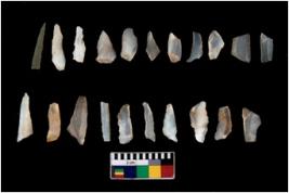 | Description / विवरण | There are n 20 flakes; they are with marginal retouch . The flakes have a flat dorsal surface, and double rigdes going parallel to its length. |