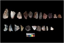 | Description / विवरण | There are n 20 flakes; they are with marginal retouch . The flakes have a flat dorsal surface, and double rigdes going parallel to its length. |