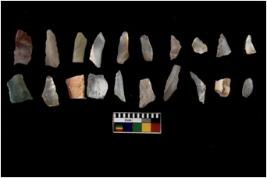 | Description / विवरण | Specimen of flakes tool with prominent flaking marks. It made up of a short flakes with sides trimmed. |