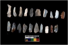 | Description / विवरण | Specimen of flakes tool with prominent flaking marks. It made up of a short flakes with sides trimmed. |