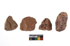 | Description / विवरण | There are n-4 of intact cores made up of Quartzite. There are multidirectional irregular dominant scar pattern on both dorsal and ventral face of the cores. |