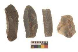 | Description / विवरण | There are n 4 flakes tool; there are flakes tool with prominent flaking marks. It made up of a large flakes with sides trimmed. |