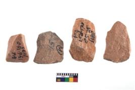 | Description / विवरण | There are n-4 of intact cores made up of Quartzite. There are multidirectional irregular dominant scar pattern on both dorsal and ventral face of the cores. |