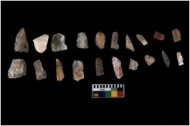 | Description / विवरण | Specimen of flakes tool with prominent flaking marks. It made up of a short flakes with sides trimmed. |