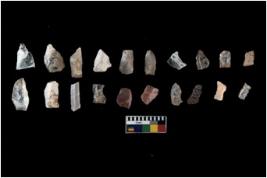 | Description / विवरण | Specimen of flakes tool with prominent flaking marks. It made up of a short flakes with sides trimmed. |