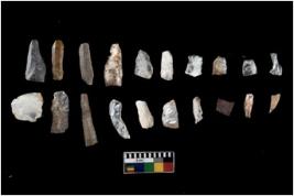 | Description / विवरण | Specimen of flakes tool with prominent flaking marks. It made up of a short flakes with sides trimmed. |