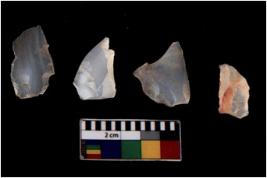 | Description / विवरण | Four utilised worked cores with sharp edges. Some of them are tapering at one end. Removal of flakes from few sides. |
