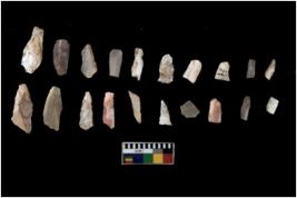 | Description / विवरण | Specimen of flakes tool with prominent flaking marks. It made up of a short flakes with sides trimmed. |