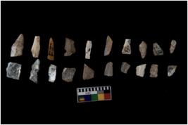 | Description / विवरण | Specimen of flakes tool with prominent flaking marks. It made up of a short flakes with sides trimmed. |