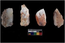 | Description / विवरण | Four utilised worked cores with sharp edges. Some of them are tapering at one end. Removal of flakes from few sides. |