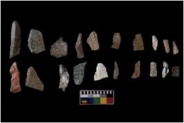 | Description / विवरण | Specimen of flakes tool with prominent flaking marks. It made up of a short flakes with sides trimmed. |