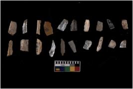 | Description / विवरण | Specimen of flakes tool with prominent flaking marks. It made up of a short flakes with sides trimmed. |