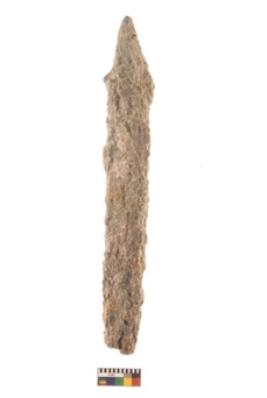| Description / विवरण | A long nail with sharp pointed functional bottom end and round slightly projected top. It is highly rusted in present condition. |