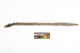 | Description / विवरण | A long nail with sharp pointed functional bottom end and round slightly projected top. It is highly rusted in present condition. |