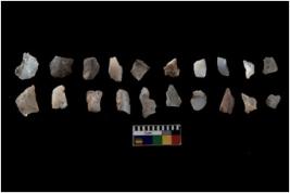 | Description / विवरण | Specimen of flakes tool with prominent flaking marks. It made up of a short flakes with sides trimmed. |