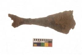 | Description / विवरण | An iron spearhead with triangular shaped body with pointed top and curved pointed edges on either side at the flat end at the bottom. it is rusted in present condition. |