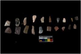 | Description / विवरण | Specimen of flakes tool with prominent flaking marks. It made up of a short flakes with sides trimmed. |