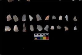 | Description / विवरण | Specimen of flakes tool with prominent flaking marks. It made up of a short flakes with sides trimmed. |