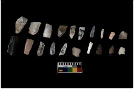 | Description / विवरण | Specimen of flakes tool with prominent flaking marks. It made up of a short flakes with sides trimmed. |