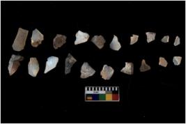 | Description / विवरण | Specimen of flakes tool with prominent flaking marks. It made up of a short flakes with sides trimmed. |