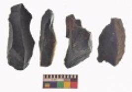 | Description / विवरण | There are n 4 utilized flake cores. There are multi directional irregular scar pattern on both dorsal and ventral face of the flake cores. Three are tapering at one end and one has sharp edge. |