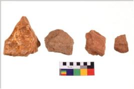 | Description / विवरण | Specimen of flakes tool with prominent flaking marks. It made up of a short flakes with sides trimmed. It is rectangular in shaped. |