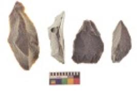 | Description / विवरण | There are n 4 utilized flake cores. There are multi directional irregular scar pattern on both dorsal and ventral face of the flake cores. Two are tapering at one end and two have sharp edges. |