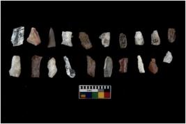 | Description / विवरण | Specimen of flakes tool with prominent flaking marks. It made up of a short flakes with sides trimmed. |
