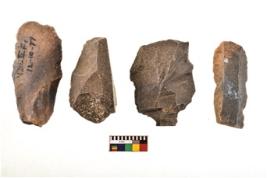 | Description / विवरण | There are n 4 utilized flakes. There are multi directional irregular scar pattern on both dorsal and ventral face of the flakes. Three are blunted at one end and one is sharp edges. |