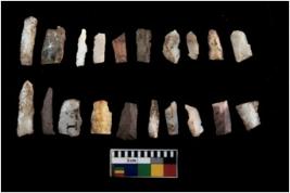 | Description / विवरण | Specimen of flakes tool with prominent flaking marks. It made up of a short flakes with sides trimmed. |