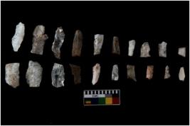 | Description / विवरण | Specimen of flakes tool with prominent flaking marks. It made up of a short flakes with sides trimmed. |