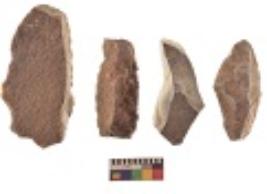 | Description / विवरण | There are n 4 utilized flake cores. There are multi directional irregular scar pattern on both dorsal and ventral face of the flake cores. Three are tapering at one end and one has sharp edge. |