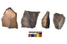 | Description / विवरण | There are n 4 utilized flakes. There are multi directional irregular scar pattern on both dorsal and ventral face of the flakes. three are tapering at one end and one is pointed edges. |