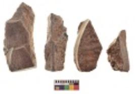 | Description / विवरण | There are n 4 utilized flake cores. There are multi directional irregular scar pattern on both dorsal and ventral face of the flake cores. Three are tapering at one end and one has sharp edge. |