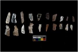 | Description / विवरण | Specimen of flakes tool with prominent flaking marks. It made up of a short flakes with sides trimmed. |