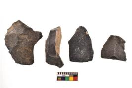 | Description / विवरण | There are n 4 utilized flakes. There are multi directional irregular scar pattern on both dorsal and ventral face of the flakes. Three are tapering base and one is blunted edges. |
