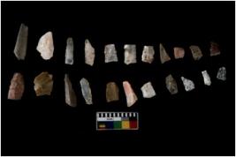 | Description / विवरण | Specimen of flakes tool with prominent flaking marks. It made up of a short flakes with sides trimmed. |