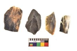 | Description / विवरण | There are n 4 utilized flakes. There are multi directional irregular scar pattern on both dorsal and ventral face of the flakes. two are tapering at one end and one has blunted and one is pointed edges. |