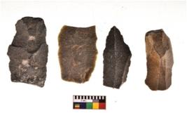 | Description / विवरण | There are n 4 utilized flakes. There are multi directional irregular scar pattern on both dorsal and ventral face of the flakes. two are tapering at one end and one is blunted and one is pointed edges. |
